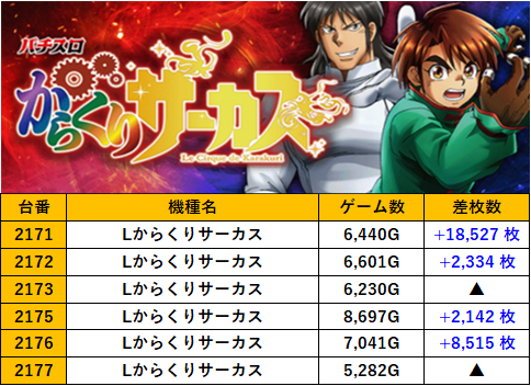 愛知がちゃぽん蟹江店 過去の取材結果はこちら 取材日 2025年5月6日(火) 内容 応援ホール マル特レポートスマスロ スロミューマル特レポートスマスロ ランキングTOP10 Lからくりサーカス Pickup箇所 その他Pickup箇所 過去の取材結果はこちら