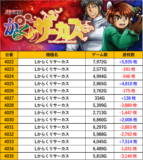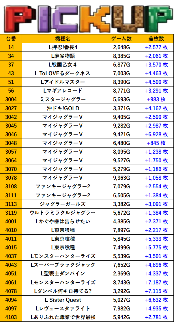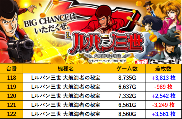 東京PIA上野店 過去の取材結果はこちら 取材日 2025年4月29日(火) 並びの人数 抽選59名 / 一般104名 内容 スロミュー七福神 応援ホール L北斗の拳 LモンキーターンV Lからくりサーカス 沖ドキ!BLACK Lルパン三世 大航海者の秘宝 L吉宗 LディスクアップULTRAREMIX その他Pickup箇所 過去の取材結果はこちら