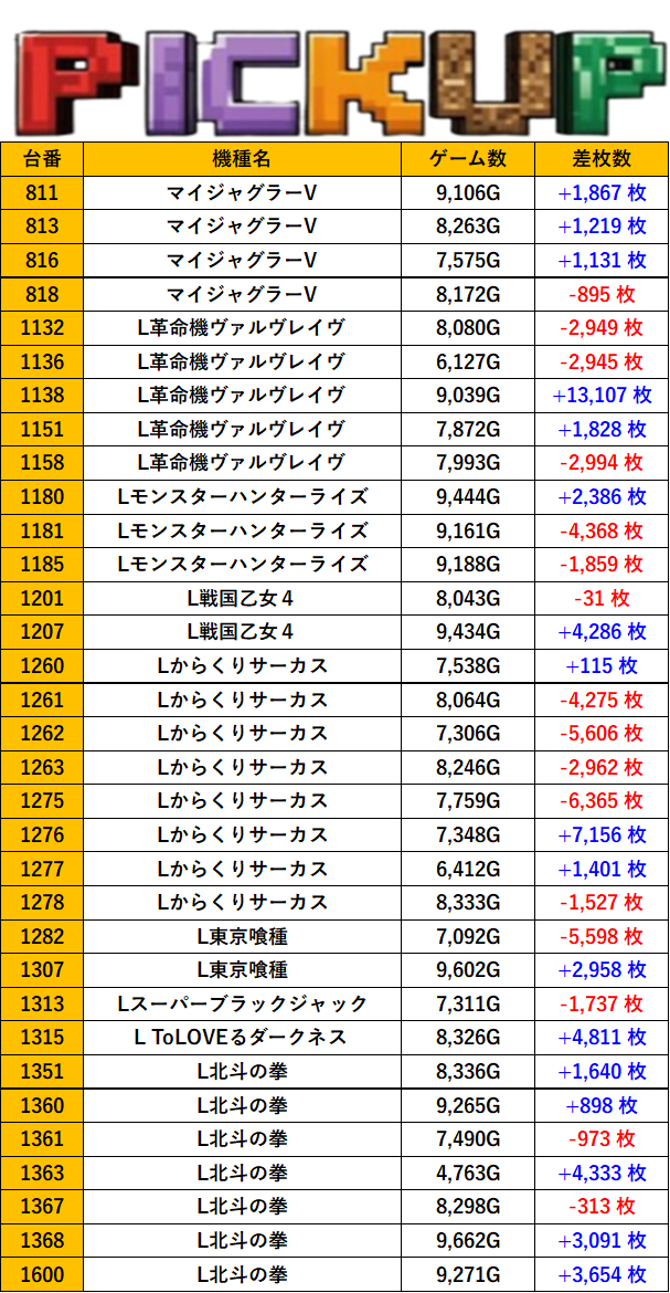 東京ジュラク王子店 過去の取材結果はこちら 取材日 2025年5月18日(日) 並びの人数 抽選375名 / 一般71名 内容 スロミュー七福神 応援ホール Lマギアレコード Lバイオハザード5 ミスタージャグラー Pickup箇所① Pickup箇所② Pickup箇所③ Pickup箇所④ Pickup箇所⑤ Pickup箇所⑥ Pickup箇所⑦ Pickup箇所⑧ Pickup箇所⑨ その他Pickup箇所 過去の取材結果はこちら