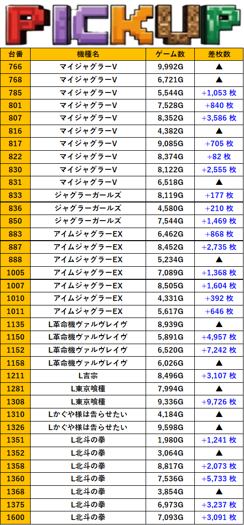 東京ジュラク王子店 過去の取材結果はこちら 取材日 2025年6月14日(土) 並びの人数 抽選50名 / 一般47名 内容 応援ホール マル特レポート スロミューマル特レポートTOP30 Pickup箇所① Pickup箇所② Pickup箇所③ Pickup箇所④ Pickup箇所⑤ Pickup箇所⑥ Pickup箇所⑦ その他Pickup箇所 過去の取材結果はこちら
