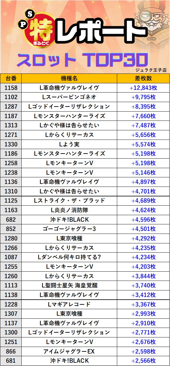 東京ジュラク王子店 過去の取材結果はこちら 取材日 2025年6月21日(土) 並びの人数 抽選56名 / 一般31名 内容 応援ホール マル特レポート スロミューマル特レポートTOP30 Pickup箇所① Pickup箇所② Pickup箇所③ Pickup箇所④ Pickup箇所⑤ Pickup箇所⑥ Pickup箇所⑦ Pickup箇所⑧ Pickup箇所⑨ Pickup箇所⑩ その他Pickup箇所 過去の取材結果はこちら