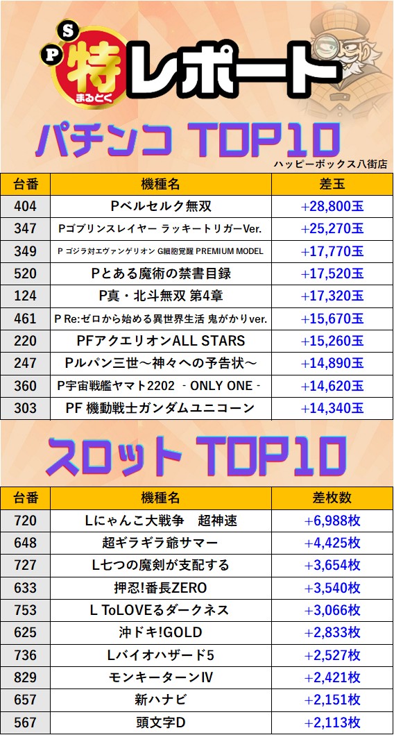 千葉ハッピーボックス八街店 過去の取材結果はこちら 取材日 2025年7月12日(土) 並びの人数 抽選8名 / 一般25名 内容 応援ホール 進め!電パチ少年 マル特レポート スロミューマル特レポートTOP10 過去の取材結果はこちら