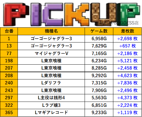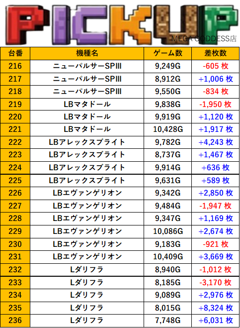 千葉MEGA GODDESS店 過去の取材結果はこちら 取材日 2025年8月21日(木) 並びの人数 抽選81名 / 一般35名 内容 スロミュー七福神 応援ホール Pickup箇所【216~236】 Pickup箇所② Pickup箇所③ Pickup箇所④ Pickup箇所⑤ Pickup箇所⑥ その他Pickup箇所 過去の取材結果はこちら
