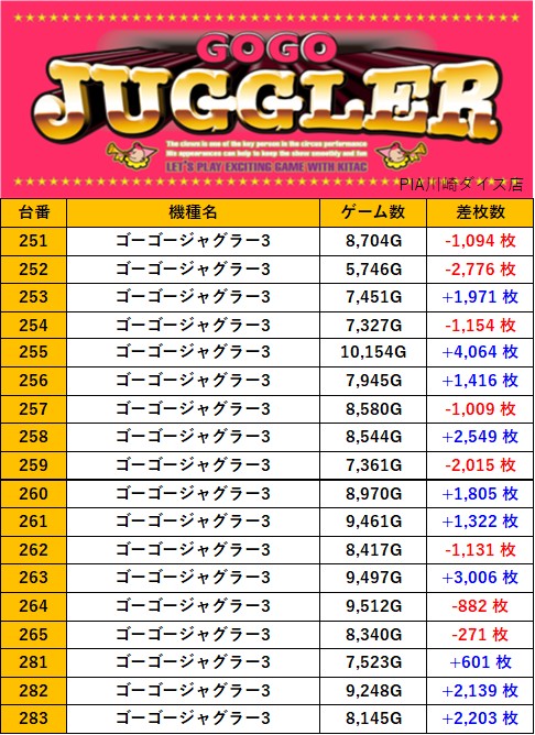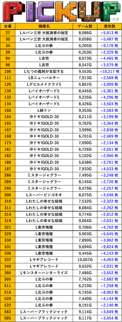 神奈川PIA川崎ダイス店 過去の取材結果はこちら 取材日 2025年7月26日(土) 並びの人数 抽選103名 / 一般133名 内容 スロミュー七福神 応援ホール マル特レポートスマスロ マル特レポート華光 L麻雀物語 LガンダムSEED L戦国乙女4 Lゴッドイーターリザレクション Lからくりサーカス LToLOVEる トランスver ゴーゴージャグラー3 Pickup箇所 その他Pickup箇所 過去の取材結果はこちら