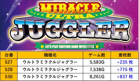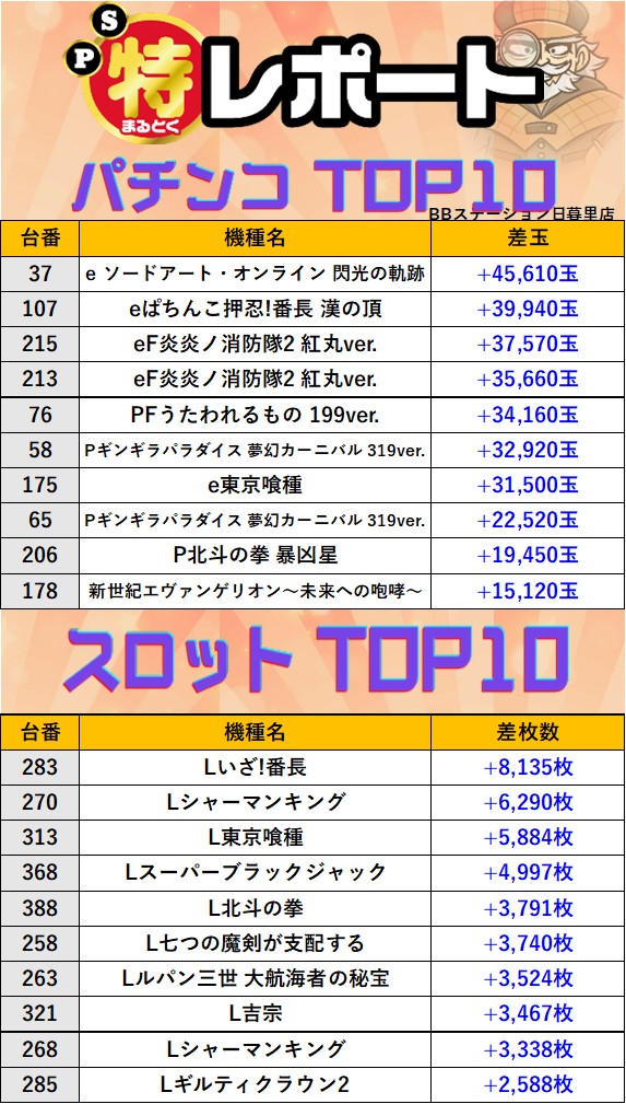 東京BBステーション日暮里店 過去の取材結果はこちら 取材日 2025年8月2日(土) 並びの人数 抽選56名 / 一般30名 内容 応援ホール マル特レポート スロミューマル特レポートTOP10 ウルトラミラクルジャグラー Lスーパーブラックジャック Lシャーマンキング L頭文字D 2nd Lデビルメイクライ5 Pickup箇所① Pickup箇所② Pickup箇所③ 過去の取材結果はこちら