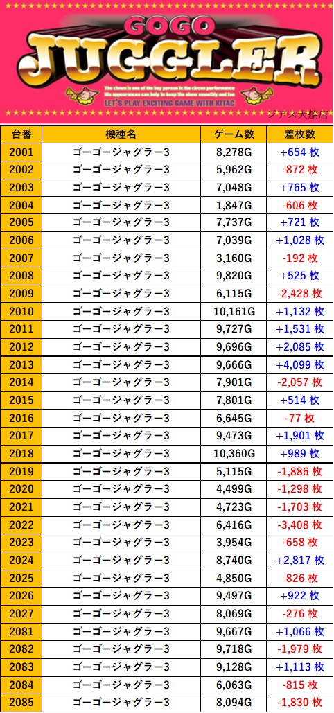 神奈川ジアス大船店 過去の取材結果はこちら 取材日 2025年8月19日(火) 並びの人数 抽選110名 / 一般60名 内容 スロミュー七福神 応援ホール マイジャグラーV ゴーゴージャグラー3 L北斗の拳 過去の取材結果はこちら
