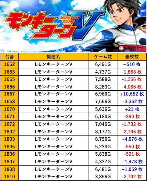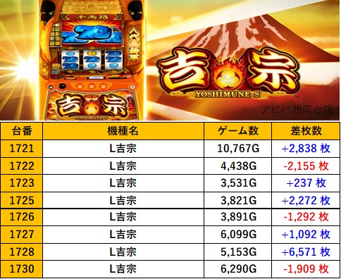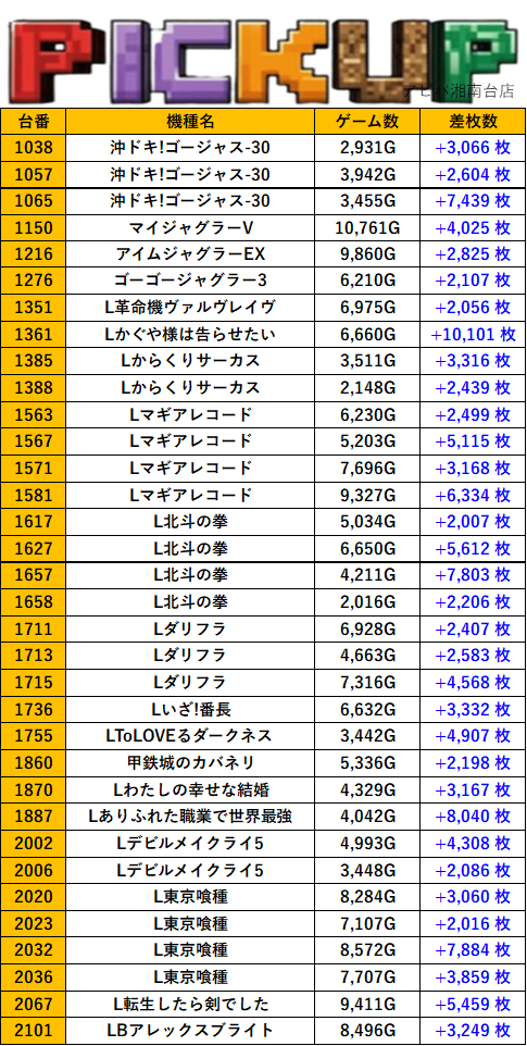 神奈川アビバ湘南台店 過去の取材結果はこちら 取材日 2025年8月24日(日) 並びの人数 抽選107名 / 一般102名 内容 スロミュー七福神 応援ホール LBエヴァンゲリオン L咲 頂上決戦 L吉宗 Lモンスターハンターライズ LモンキーターンV Pickup箇所 その他Pickup箇所 過去の取材結果はこちら