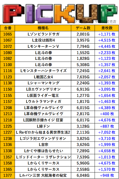 岐阜ラッキープラザ1050可児店 過去の取材結果はこちら 取材日 2025年8月3日(日) 並びの人数 抽選11名 / 一般10名 内容 応援ホール マル特レポートスマスロ スロミューマル特レポートスマスロ ランキングTOP10 L東京喰種 Lダンベル何キロ持てる? Pickup箇所 その他Pickup箇所① その他Pickup箇所② 過去の取材結果はこちら