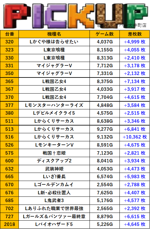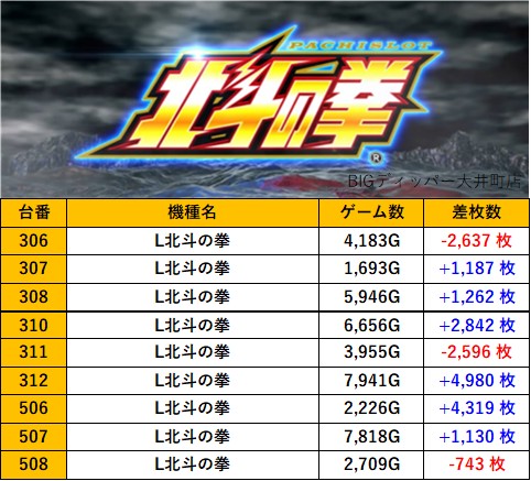 東京BIGディッパー大井町店 過去の取材結果はこちら 取材日 2025年8月24日(日) 並びの人数 抽選50名 / 一般22名 内容 スロミュー七福神 応援ホール Lマギアレコード L緑ドン Lダリフラ L北斗の拳 甲鉄城のカバネリ L押忍!番長4 新ハナビ その他Pickup箇所 過去の取材結果はこちら