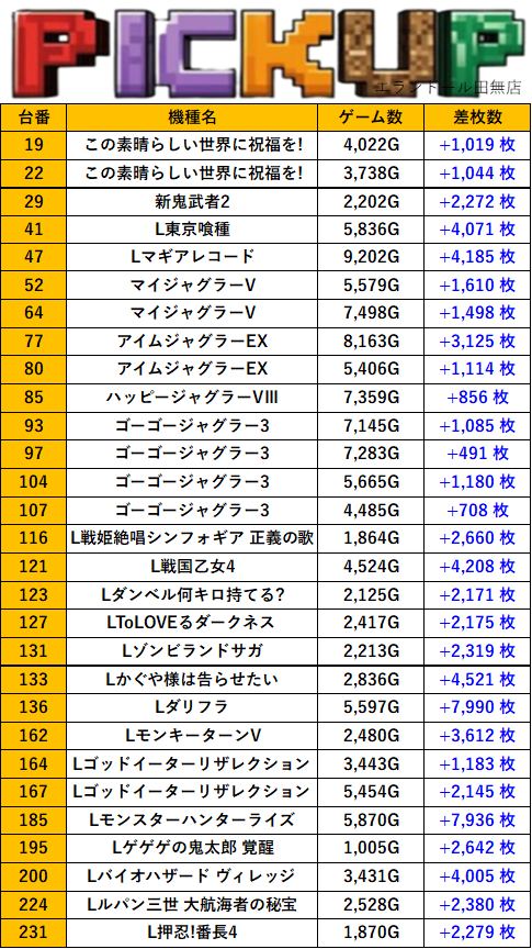 店舗詳細 取材日 2025年9月7日(日) 実施店舗 エランドール田無店 並びの人数 抽選14名 / 一般9名 内容 ※他スロミュー取材1件 新ハナビ 沖ドキ!DUO-30 L頭文字D 2nd バラエティ Pickup箇所① Pickup箇所② Pickup箇所③ Pickup箇所④ Pickup箇所⑤ その他Pickup箇所 前のページに戻る 過去の結果はこちら