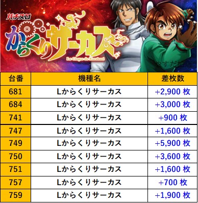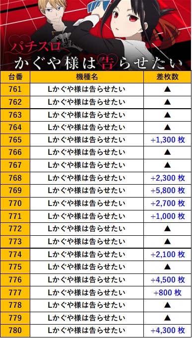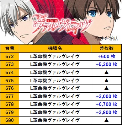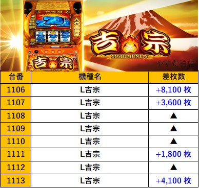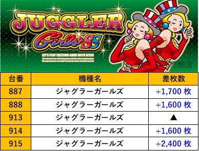 千葉やすだ柏店 過去の取材結果はこちら 取材日 2025年9月13日(土) 並びの人数 抽選113名 / 一般118名 内容 スロミュー七福神 応援ホール ジャグラーガールズ L炎炎ノ消防隊 L吉宗 LモンキーターンV Lかぐや様は告らせたい L革命機ヴァルヴレイヴ Pickup箇所① Pickup箇所② Pickup箇所③ Pickup箇所④ 過去の取材結果はこちら