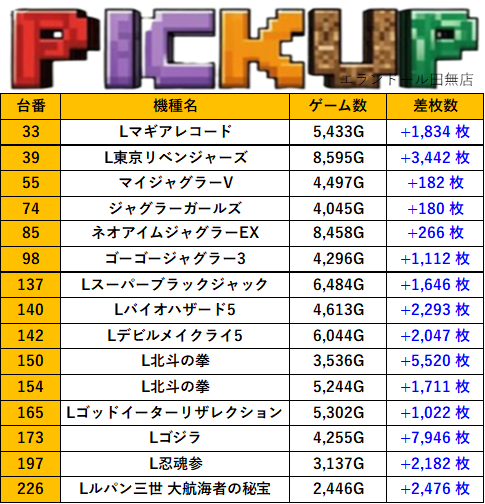 東京エランドール田無店 過去の取材結果はこちら 取材日 2025年9月21日(日) 並びの人数 抽選8名 / 一般5名 内容 スロミュー七福神 応援ホール Lかぐや様は告らせたい L頭文字D 2nd Lラブ嬢3 L防振り Lいざ!番長 Pickup箇所① Pickup箇所② Pickup箇所③ その他Pickup箇所 過去の取材結果はこちら