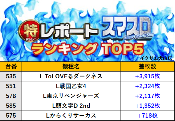 愛知イクサム犬山店 過去の取材結果はこちら 取材日 2025年9月27日(土) 並びの人数 抽選3名 / 一般19名 内容 応援ホール マル特レポートスマスロ スロミューマル特レポートスマスロ ランキングTOP5 Pickup箇所 その他Pickup箇所 過去の取材結果はこちら