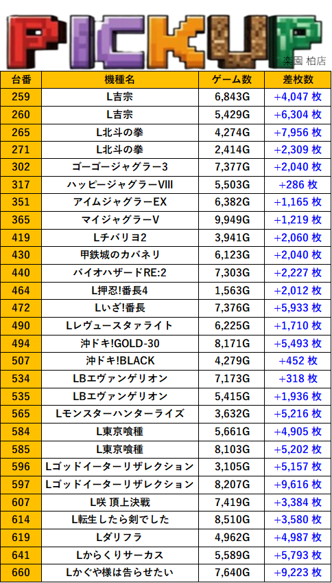 店舗詳細 取材日 2025年9月17日(水) 実施店舗 楽園 柏店 並びの人数 抽選51名 / 一般23名 内容 ※他スロミュー取材1件 LBクレアの秘宝伝 L東京リベンジャーズ Lからくりサーカス Pickup箇所① Pickup箇所② Pickup箇所③ Pickup箇所④ Pickup箇所⑤ Pickup箇所⑥ Pickup箇所⑦ Pickup箇所⑧ 前のページに戻る 過去の結果はこちら
