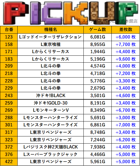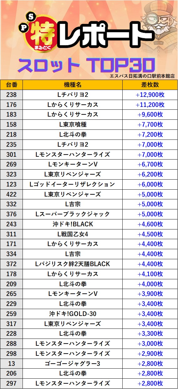 神奈川エスパス日拓溝の口駅前本館店 過去の取材結果はこちら 取材日 2025年9月30日(火) 並びの人数 抽選93名 / 一般18名 内容 マル特レポート 応援ホール スロミューマル特レポートTOP30 L吉宗 Pickup箇所① Pickup箇所② Pickup箇所③ Pickup箇所④ Pickup箇所⑤ Pickup箇所⑥ Pickup箇所⑦ Pickup箇所⑧ Pickup箇所⑨ その他Pickup箇所 過去の取材結果はこちら