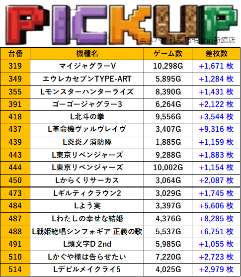 千葉エスパス日拓稲毛駅前新館店 過去の取材結果はこちら 取材日 2025年9月17日(水) 並びの人数 抽選50名 / 一般10名 内容 スロミュー七福神 応援ホール LBアレックスブライト Lダリフラ Pickup箇所① Pickup箇所② Pickup箇所③ Pickup箇所④ Pickup箇所⑤ Pickup箇所⑥ その他Pickup箇所 過去の取材結果はこちら