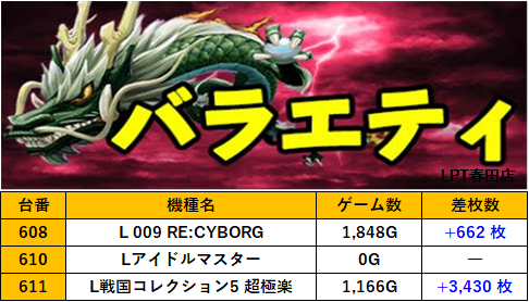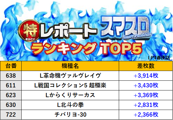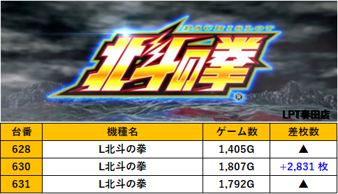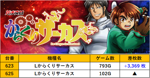 愛知LPT春田店 過去の取材結果はこちら 取材日 2025年9月9日(火) 並びの人数 抽選7名 内容 応援ホール マル特レポートスマスロ スロミューマル特レポートスマスロ ランキングTOP5 L北斗の拳 Lからくりサーカス Pickup箇所 その他Pickup箇所 過去の取材結果はこちら