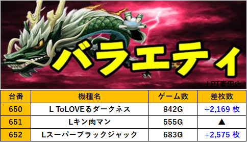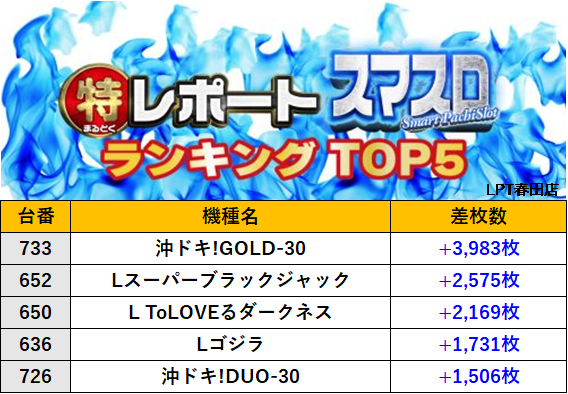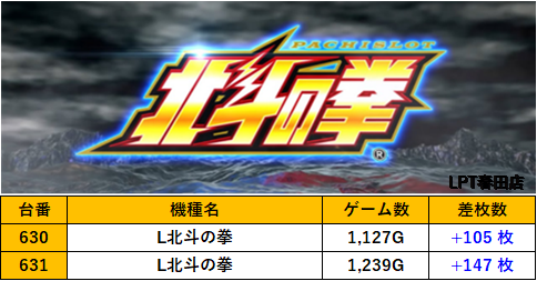 愛知LPT春田店 過去の取材結果はこちら 取材日 2025年9月13日(土) 並びの人数 一般18名 内容 応援ホール マル特レポートスマスロ スロミューマル特レポートスマスロ ランキングTOP5 L北斗の拳 Pickup箇所 その他Pickup箇所 過去の取材結果はこちら