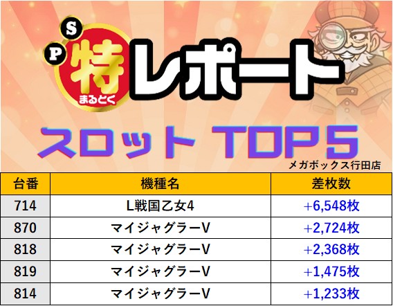 埼玉メガボックス行田店 過去の取材結果はこちら 取材日 2025年9月6日(土) 並びの人数 抽選4名 / 一般6名 内容 応援ホール マル特レポート スロミューマル特レポートTOP5 Pickup箇所 その他Pickup箇所 過去の取材結果はこちら