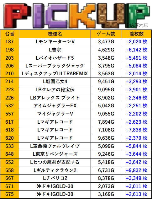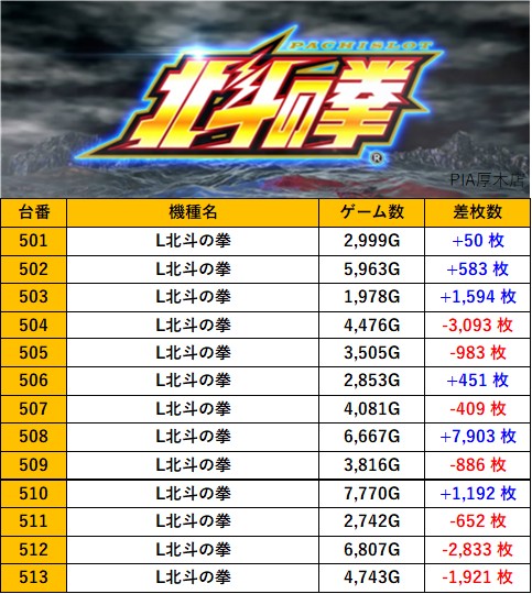 神奈川PIA厚木店 過去の取材結果はこちら 取材日 2025年9月17日(水) 並びの人数 抽選13名 / 一般29名 内容 スロミュー七福神 応援ホール ミスタージャグラー L東京喰種 L北斗の拳 その他Pickup箇所 過去の取材結果はこちら