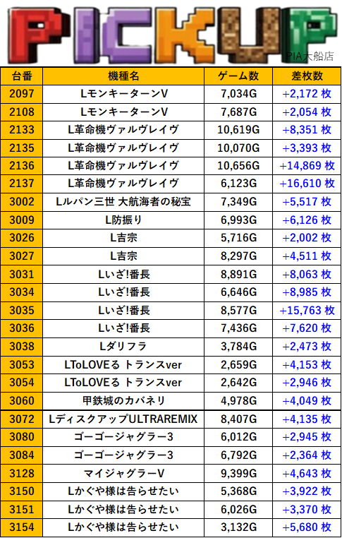 店舗詳細 取材日 2025年9月14日(日) 実施店舗 PIA大船店 並びの人数 抽選67名 / 一般40名 内容 ※他スロミュー取材1件 Lマギアレコード L北斗の拳 L東京喰種 L東京リベンジャーズ アイムジャグラーEX Lからくりサーカス その他Pickup箇所 前のページに戻る 過去の結果はこちら