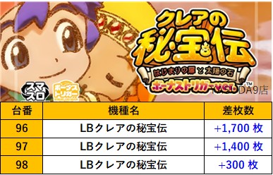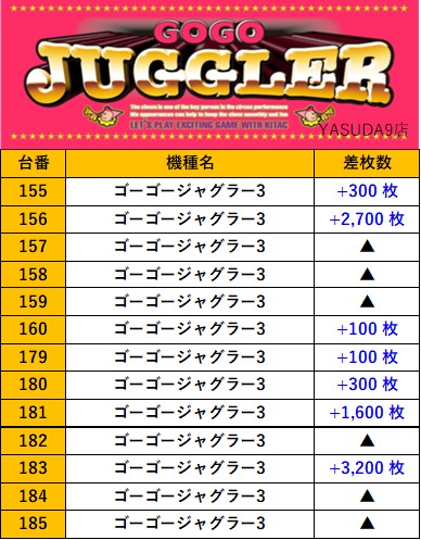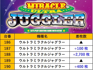 東京YASUDA9店 過去の取材結果はこちら 取材日 2025年9月13日(土) 並びの人数 抽選53名 / 一般8名 内容 スロミュー七福神 応援ホール LBクレアの秘宝伝 ウルトラミラクルジャグラー ゴーゴージャグラー3 過去の取材結果はこちら