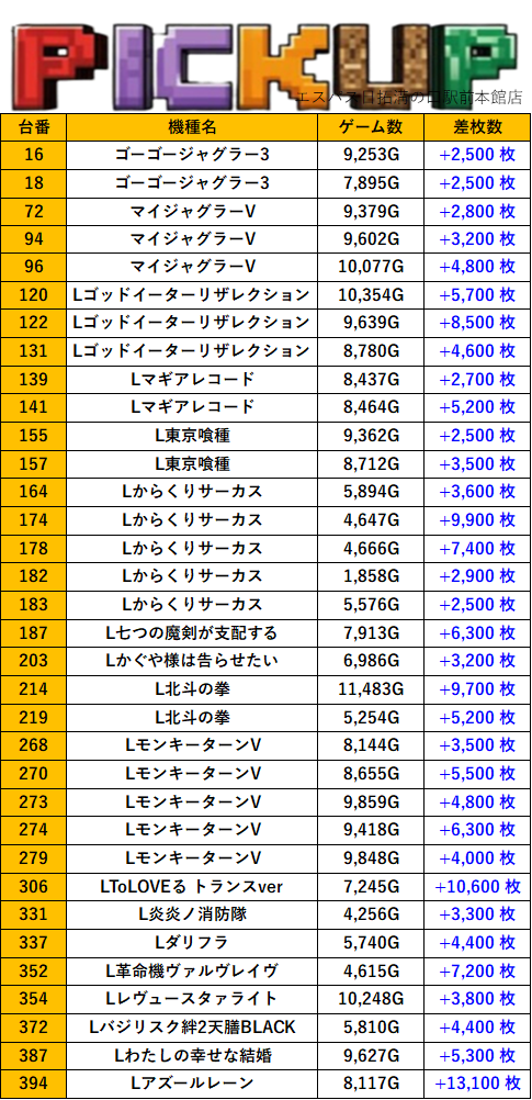 店舗詳細 取材日 2025年10月1日(水) 実施店舗 エスパス日拓溝の口駅前本館店 並びの人数 抽選387名 / 一般31名 内容 ※他スロミュー取材1件 Lモンスターハンターライズ Pickup箇所① Pickup箇所② Pickup箇所③ Pickup箇所④ Pickup箇所⑤ Pickup箇所⑥ Pickup箇所⑦ Pickup箇所⑧ その他Pickup箇所 前のページに戻る 過去の結果はこちら