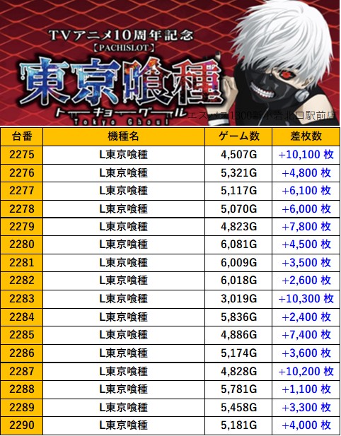 東京エスパス1300新小岩北口駅前店 過去の取材結果はこちら 取材日 2025年10月1日(水) 並びの人数 抽選100名 / 一般11名 内容 応援ホール 極パス(エスパス一斉取材) L東京喰種 L東京リベンジャーズ 甲鉄城のカバネリ 過去の取材結果はこちら