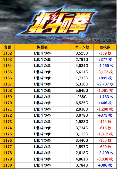 神奈川PIA金沢八景店 過去の取材結果はこちら 取材日 2025年9月22日(月) 並びの人数 抽選56名 / 一般57名 内容 スロミュー七福神 応援ホール マイジャグラーV Lかぐや様は告らせたい L北斗の拳 その他Pickup箇所 過去の取材結果はこちら