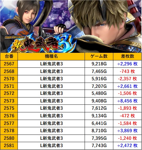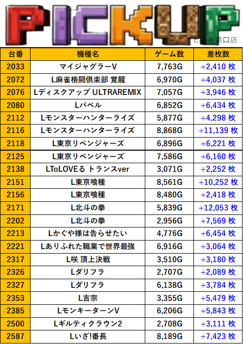 店舗詳細 取材日 2025年10月11日(土) 実施店舗 ヒロキ東口店 並びの人数 抽選120名 / 一般50名 内容 ※他スロミュー取材1件 Lスーパーブラックジャック 甲鉄城のカバネリ ジャグラーガールズ ネオアイムジャグラーEX Lマギアレコード L新鬼武者3 その他Pickup箇所 前のページに戻る 過去の結果はこちら
