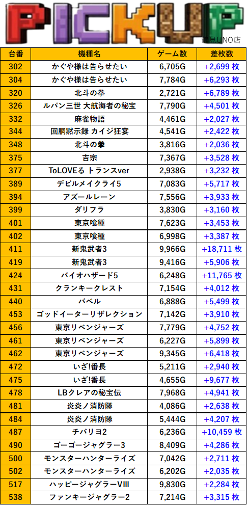 神奈川鶴見UNO店 過去の取材結果はこちら 取材日 2025年10月19日(日) 並びの人数 抽選80名 / 一般20名 内容 スロミュー七福神 応援ホール モンキーターンV ミスタージャグラー からくりサーカス その他Pickup箇所 過去の取材結果はこちら