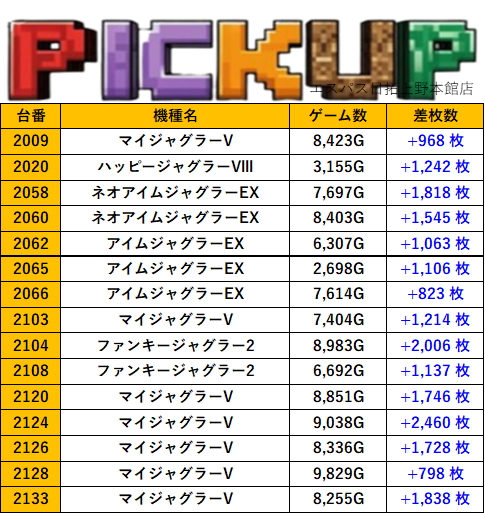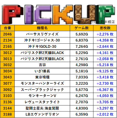 東京エスパス日拓上野本館店 過去の取材結果はこちら 取材日 2025年10月18日(土) 並びの人数 抽選356名(入場くんオンライン) / 一般54名 内容 応援ホール マル特レポート スロミューマル特レポートTOP30 東京リベンジャーズ Pickup箇所① Pickup箇所② その他Pickup箇所① その他Pickup箇所② 過去の取材結果はこちら