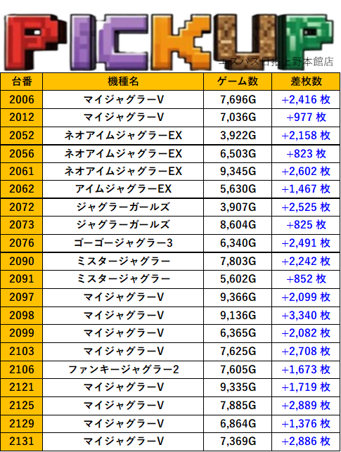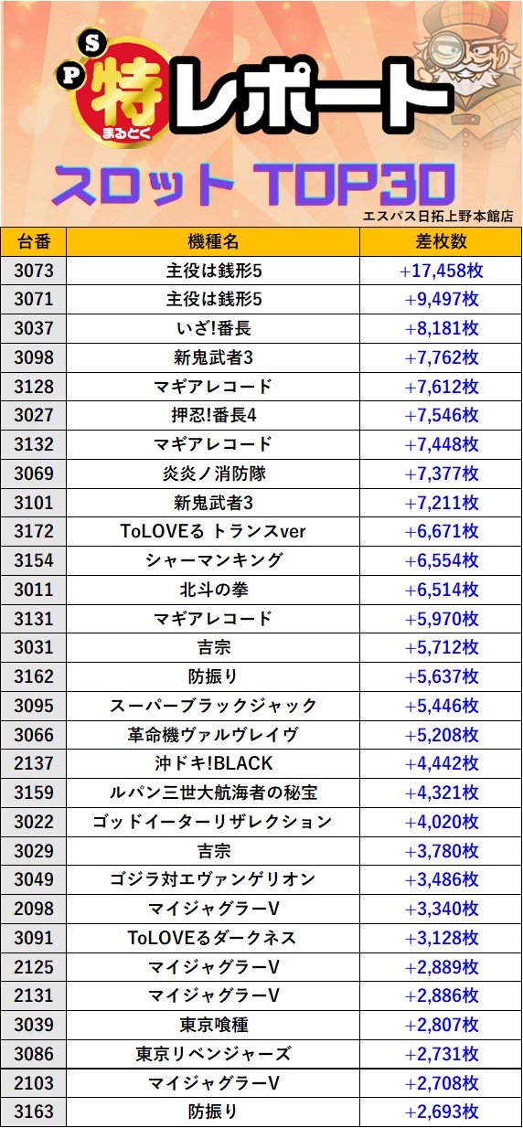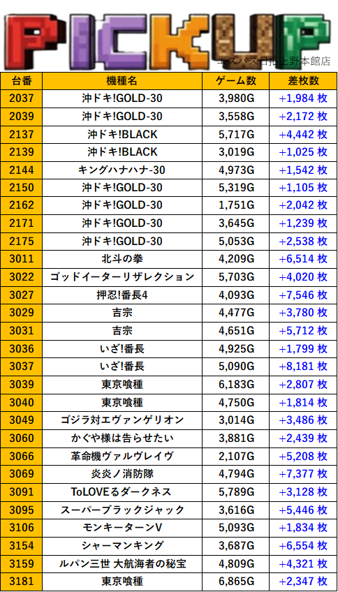 東京エスパス日拓上野本館店 過去の取材結果はこちら 取材日 2025年10月19日(日) 並びの人数 抽選89名 / 一般49名 内容 応援ホール マル特レポート スロミューマル特レポートTOP30 防振り 主役は銭形5 Pickup箇所① Pickup箇所② Pickup箇所③ Pickup箇所④ その他Pickup箇所① その他Pickup箇所② 過去の取材結果はこちら