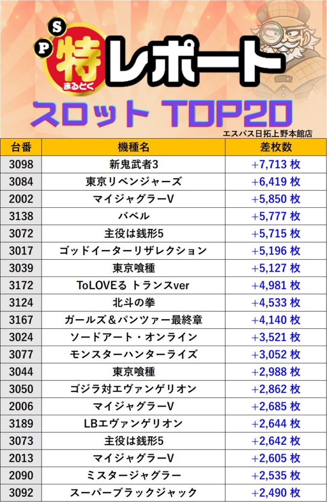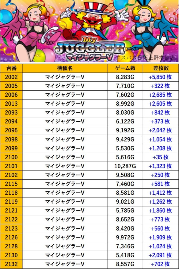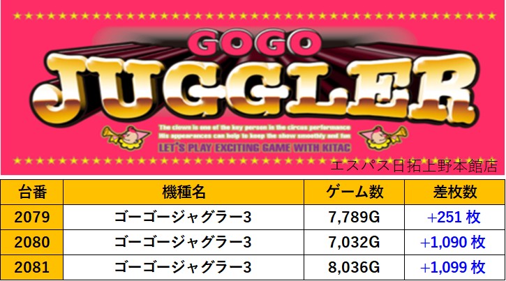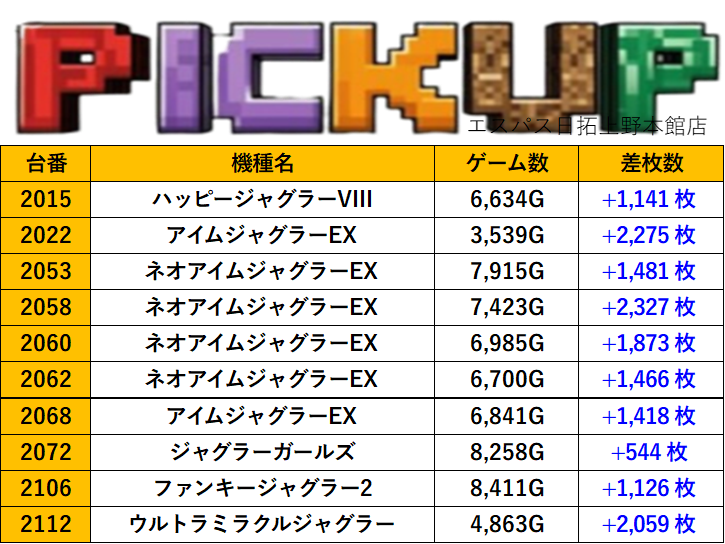東京エスパス日拓上野本館店 過去の取材結果はこちら 取材日 2025年10月24日(金) 内容 応援ホール マル特レポート スロミューマル特レポートTOP20 ミスタージャグラー Pickup箇所① Pickup箇所② Pickup箇所③ その他Pickup箇所① その他Pickup箇所② 過去の取材結果はこちら
