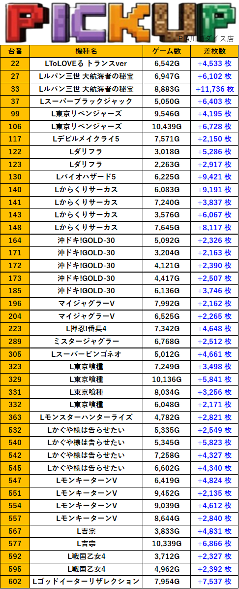 店舗詳細 取材日 2025年10月1日(水) 実施店舗 PIA川崎ダイス店 並びの人数 抽選70名 / 一般50名 内容 ※他スロミュー取材1件 Lアズールレーン Lマギアレコード ゴーゴージャグラー3 Pickup箇所 その他Pickup箇所 前のページに戻る 過去の結果はこちら