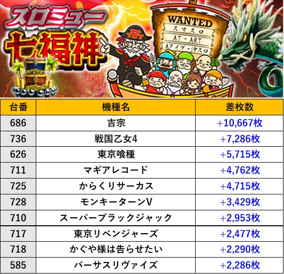 神奈川楽園 上永谷店 過去の取材結果はこちら 取材日 2025年10月4日(土) 並びの人数 抽選10名 / 一般7名 内容 スロミュー七福神 応援ホール スロミュー七福神ランキングTOP10 過去の取材結果はこちら