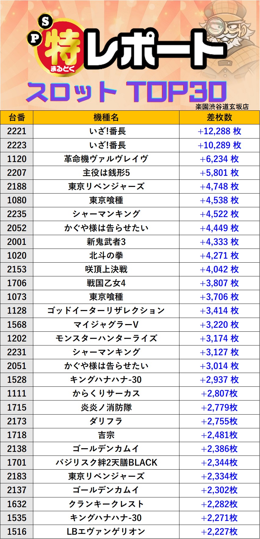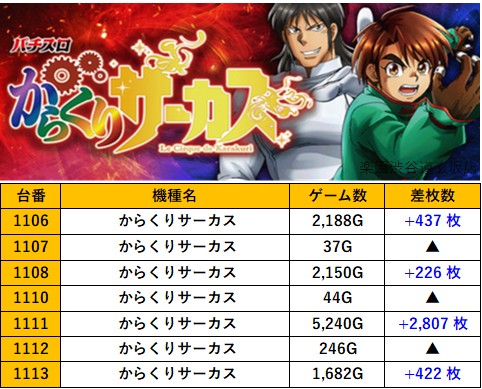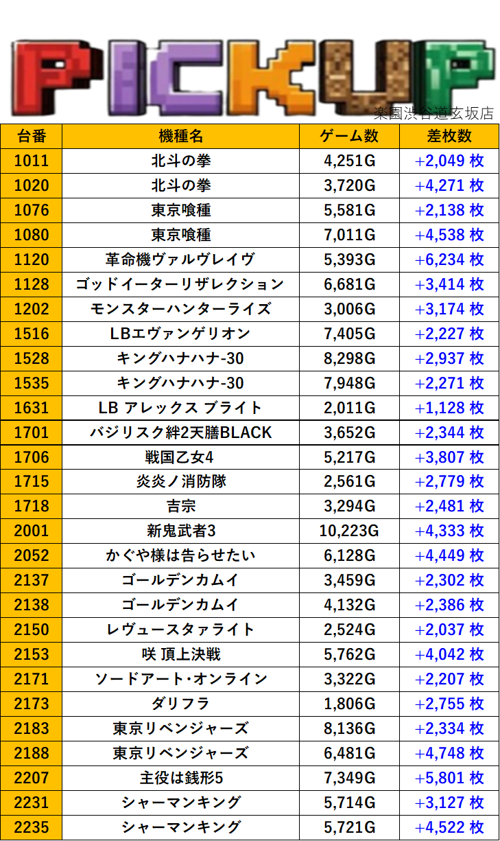 東京楽園渋谷道玄坂店 過去の取材結果はこちら 取材日 2025年10月26日(日) 並びの人数 抽選38名 / 一般40名 内容 応援ホール マル特レポート スロミューマル特レポートランキングTOP30 いざ!番長 からくりサーカス クランキークレスト Pickup箇所① pickup箇所② pickup箇所③ pickup箇所④ pickup箇所⑤ その他pickup箇所 過去の取材結果はこちら