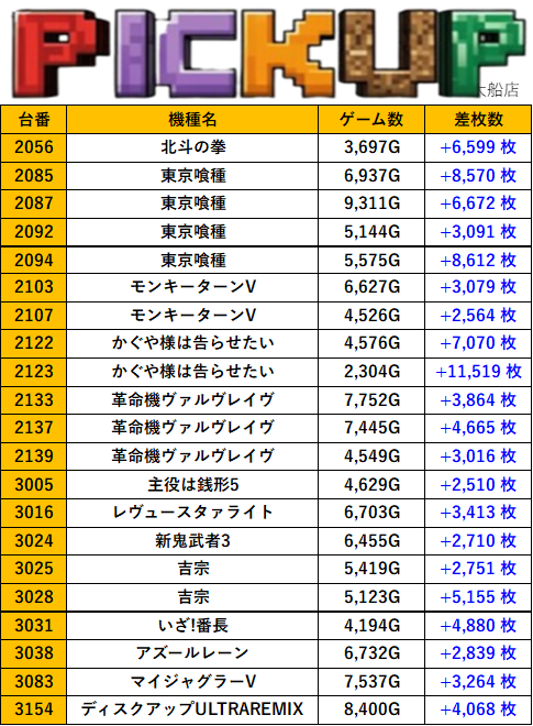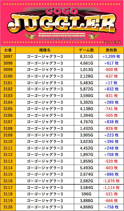 神奈川PIA大船店 過去の取材結果はこちら 取材日 2025年10月19日(日) 並びの人数 抽選75名 / 一般36名 内容 スロミュー七福神 応援ホール マギアレコード ゴーゴージャグラー3 東京リベンジャーズ その他Pickup箇所 過去の取材結果はこちら
