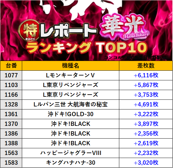 愛知コンコルド880愛西日比野駅前店 過去の取材結果はこちら 取材日 2025年10月1日(水) 並びの人数 抽選9名 / 一般46名 内容 マル特レポート華光 応援ホール スロミューマル特レポート華光 ランキングTOP10 ハッピージャグラーVⅢ Pickup箇所① Pickup箇所② Pickup箇所③ Pickup箇所④ その他Pickup箇所 過去の取材結果はこちら