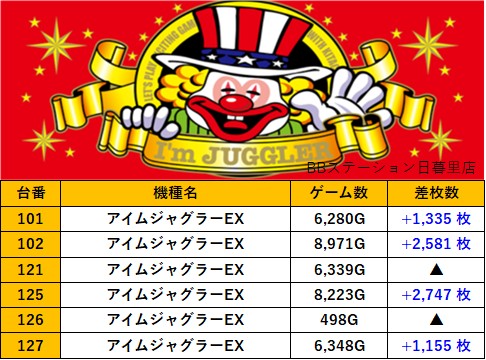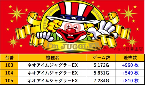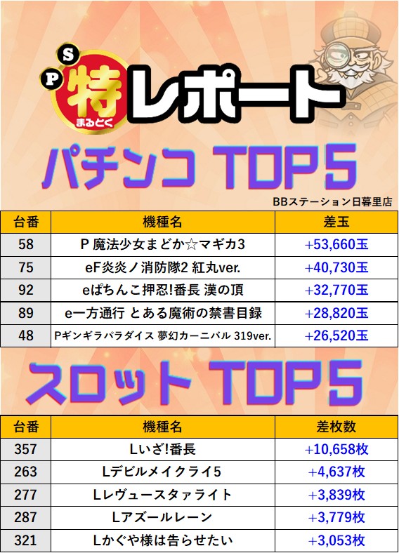 東京BBステーション日暮里店 過去の取材結果はこちら 取材日 2025年10月11日(土) 並びの人数 抽選41名 / 一般14名 内容 マル特レポート 応援ホール スロミューマル特レポートTOP5 ネオアイムジャグラーEX Lいざ!番長 Pickup箇所① Pickup箇所② Pickup箇所③ 過去の取材結果はこちら