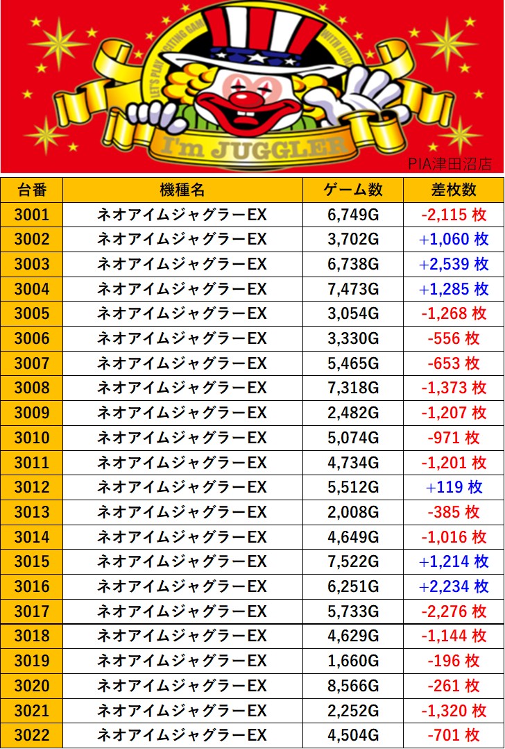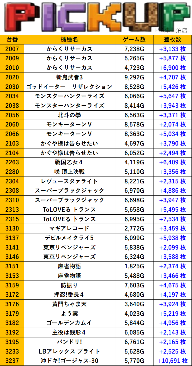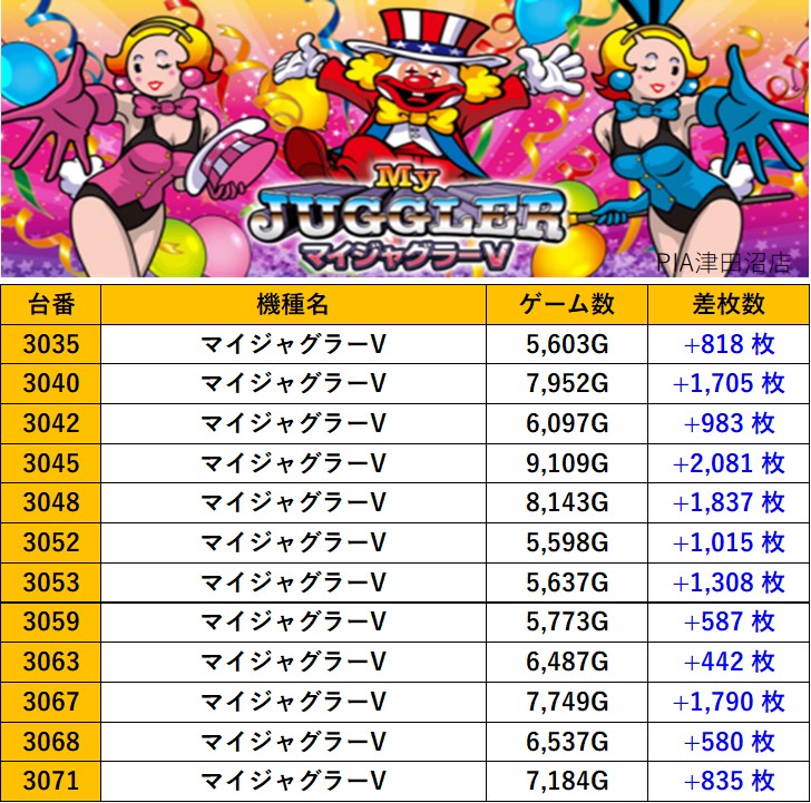 千葉PIA津田沼店 過去の取材結果はこちら 取材日 2025年10月25日(土) 並びの人数 抽選72名 / 一般86名 内容 スロミュー七福神 応援ホール ダリフラ アズールレーン 銭形5 バイオハザード5 吉宗 東京喰種 ネオアイムジャグラーEX Pickup箇所 その他Pickup箇所 過去の取材結果はこちら
