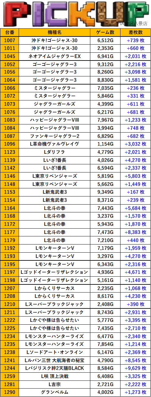 神奈川PIA金沢八景店 過去の取材結果はこちら 取材日 2025年10月11日(土) 並びの人数 抽選68名 / 一般28名 内容 スロミュー七福神 応援ホール Lバベル L東京喰種 Lマギアレコード 甲鉄城のカバネリ バラエティコーナー Pickup箇所① Pickup箇所② その他Pickup箇所 過去の取材結果はこちら