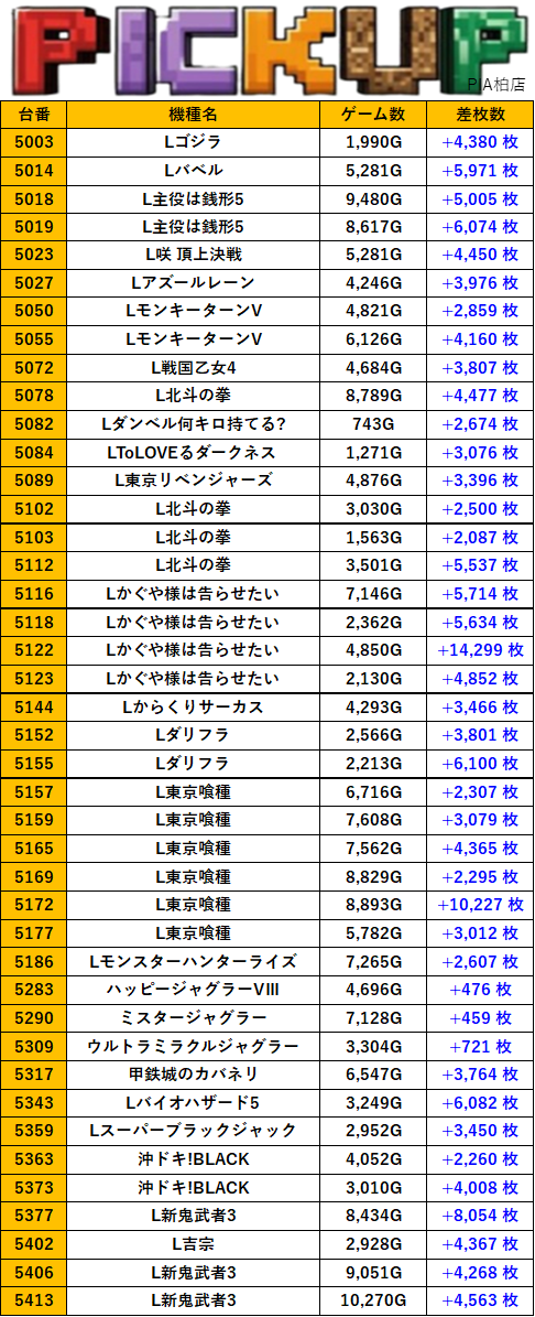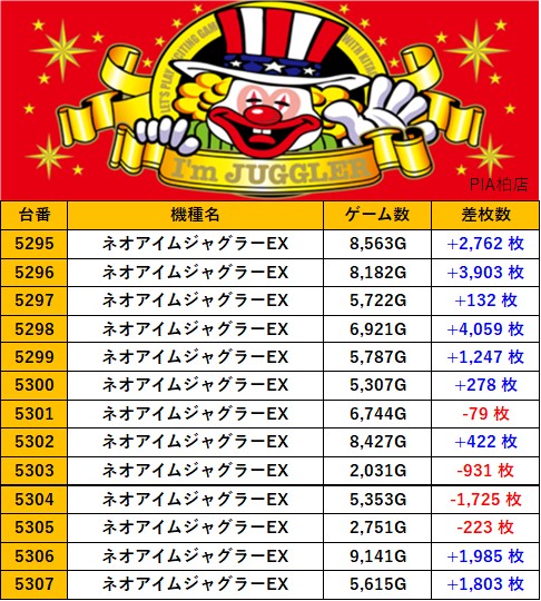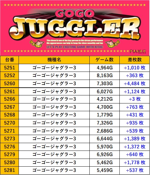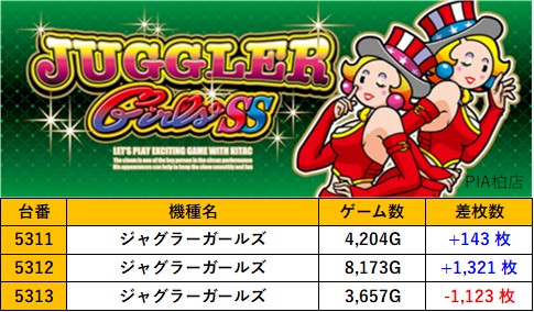 千葉PIA柏店 過去の取材結果はこちら 取材日 2025年10月8日(水) 並びの人数 抽選54名 / 一般161名 内容 スロミュー七福神 応援ホール Lマギアレコード ネオアイムジャグラーEX Lいざ!番長 マイジャグラーV LToLOVEる トランスver ジャグラーガールズ Pickup箇所 その他Pickup箇所 過去の取材結果はこちら