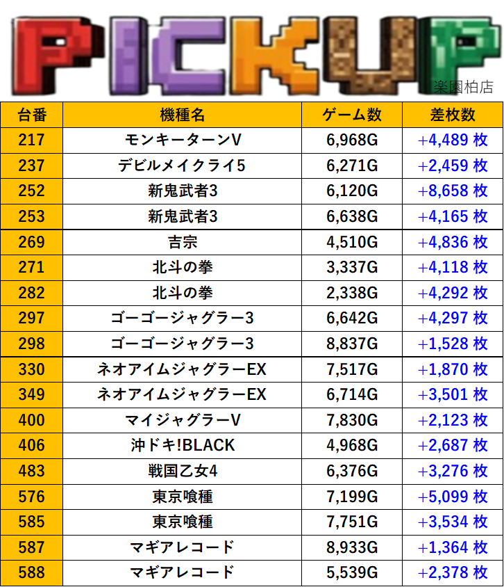 千葉楽園 柏店 過去の取材結果はこちら 取材日 2025年11月7日(金) 並びの人数 抽選97名 / 一般39名 内容 スロミュー七福神 応援ホール Pickup箇所① Pickup箇所② Pickup箇所③ Pickup箇所④ Pickup箇所⑤ Pickup箇所⑥ Pickup箇所⑦ Pickup箇所⑧ Pickup箇所⑨ Pickup箇所⑩ Pickup箇所⑪ その他Pickup箇所 過去の取材結果はこちら