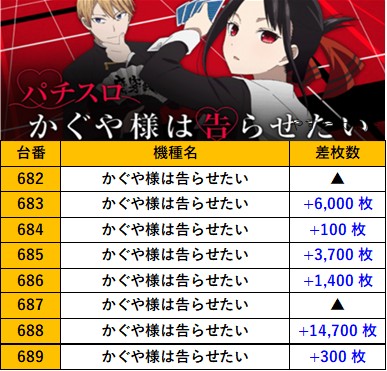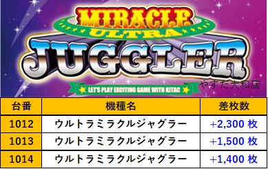 神奈川やすだ 大和店 過去の取材結果はこちら 取材日 2025年10月31日(金) 並びの人数 抽選125名 / 一般81名 内容 スロミュー七福神 応援ホール ウルトラミラクルジャグラー かぐや様は告らせたい 新鬼武者3 過去の取材結果はこちら