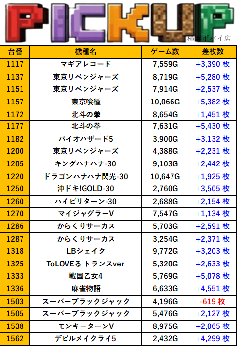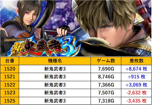 神奈川横浜ポパイ店 過去の取材結果はこちら 取材日 2025年11月1日(土) 並びの人数 抽選63名 / 一般36名 内容 スロミュー七福神 応援ホール ファンキージャグラー2 ハナハナホウオウ天翔-30 いざ!番長 ゴッドイーターリザレクション 新鬼武者3 その他Pickup箇所 過去の取材結果はこちら