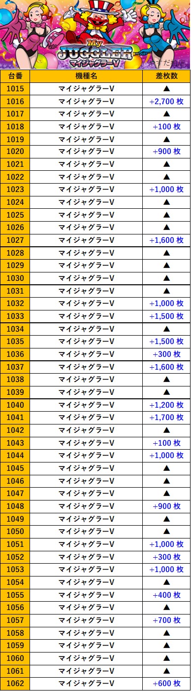 千葉やすだ 柏店 過去の取材結果はこちら 取材日 2025年11月29日(土) 並びの人数 抽選111名 / 一般105名 内容 スロミュー七福神 応援ホール Pickup箇所① Pickup箇所② Pickup箇所③ Pickup箇所④ Pickup箇所⑤ Pickup箇所⑥ 過去の取材結果はこちら