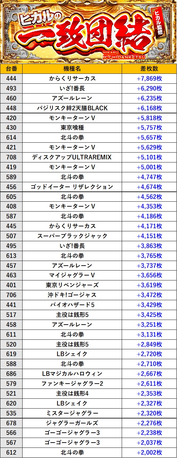大阪HYPERARROW深井店 過去の取材結果はこちら 取材日 2025年11月1日(土) 並びの人数 抽選121名 / 一般40名 内容 ヒカルの一致団結 『ヒカルの一致団結』差枚数TOP40 過去の取材結果はこちら