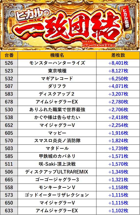 大阪ARROW志紀駅前店 過去の取材結果はこちら 取材日 2025年11月1日(土) 並びの人数 抽選26名 / 一般22名 内容 ヒカルの一致団結 『ヒカルの一致団結』差枚数TOP20 過去の取材結果はこちら