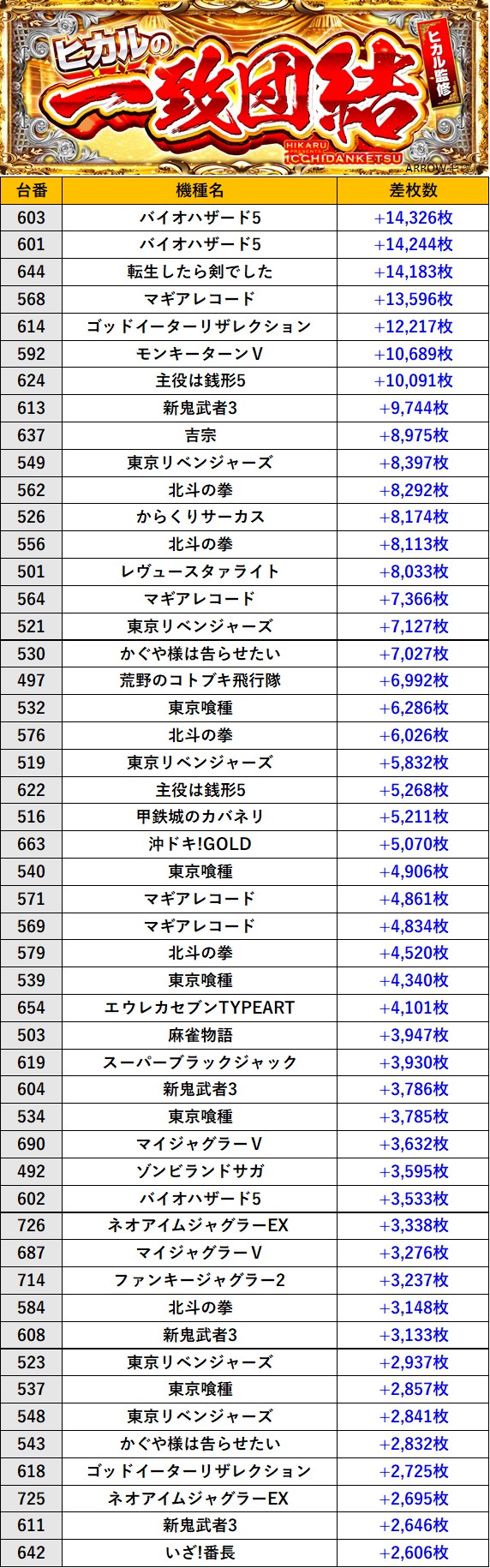 神奈川ARROW平塚店 過去の取材結果はこちら 取材日 2025年11月1日(土) 並びの人数 抽選308名 / 一般47名 内容 🌓ヒカルの一致団結🌓 カルビ来店 『ヒカルの一致団結』ランキング 過去の取材結果はこちら
